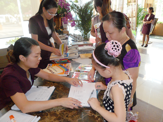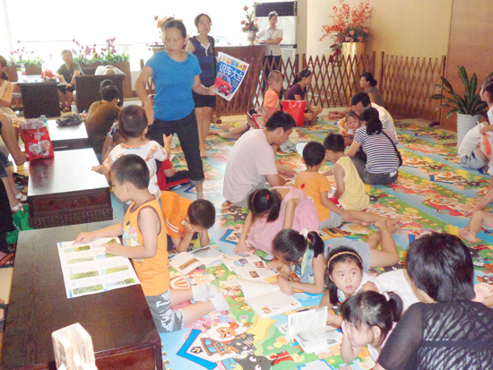 活動從9:30正式開始,但是8點多鐘就陸陸續續有家長帶小朋友過來簽到報名。簽到后,每個小朋友都可以領一本自己比較感興趣的圖書。在人信·太子灣營銷中心專門設置的看書區內,小朋友們捧著書看得津津有味,也就平時學習中的問題進行熱烈的討論。年齡偏小的小朋友則在家長的帶領下看圖識字,一位家長說自己的孩子3歲了,在家每次學習就搗亂,今天看到周圍的哥哥姐姐都在看書,小家伙也是學習熱情高漲。她覺得人信·太子灣舉辦這樣的活動很有意義,同時表示如果有時間下次還會帶小朋友參加。
