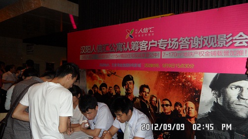 當天下午15點30分,近200名人信匯客戶如約來到了觀影答謝活動現場,寬大的放映廳座無虛席?蛻魝儜阎d奮的心情,體驗著好萊塢大片《敢死隊2》,比大片更讓人興奮的,是電影開播前漢陽人信匯1/3號樓全新精品住宅的產品推介!罢郎蕚溥@幾天帶妻子一起去看《敢死隊2》,想不到人信匯提前為我們準備了。在5號樓公寓開盤沒搶到房子本來有些失望,可聽完了今天1/3號樓的產品介紹,覺得性價比還是非常不錯,愿意再等人信匯!蓖跸壬d奮的告訴記者。