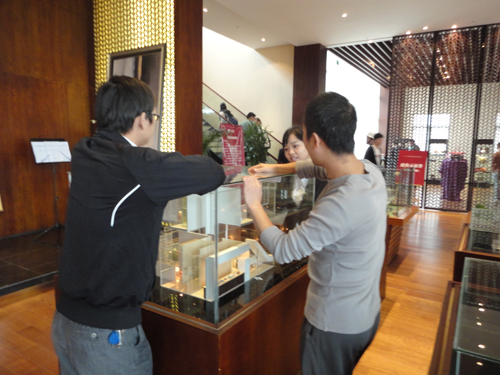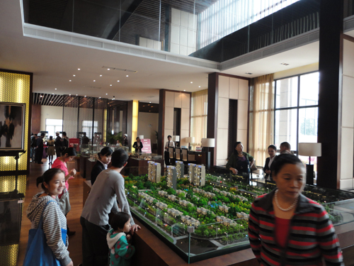 特賣區外置業顧問細心為客戶介紹別墅熱銷戶型